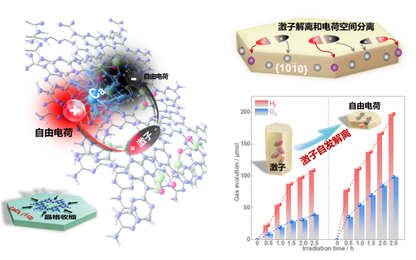 PTI是一种以碳、氮为主要成分的聚合物半导体材料,具有成本低、环境友好、结构适合光催化等优点,在实现低成本、规模化太阳能制氢方面具有广阔前景。然而,它的实际效率一直不高,主要是因为其在光照下产生的正负电荷,也就是电子和空穴,很容易被“绑定”在一起形成“激子”,并最终重新“拥抱”在一起而消失,无法有效参与制氢和制氧反应。