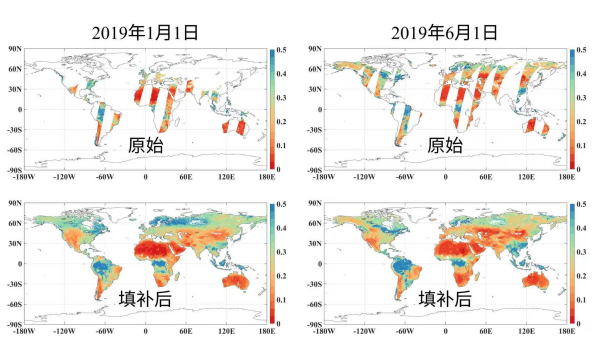 “当前填补缺失数据主要有两类方法:一类是传统插值法,依赖已知数据推测缺失区域,适用于小范围缺失,但在大片空白区容易失效;另一类是基于大数据分析的机器学习方法,能够通过分析全球数据,寻找土壤水分与降雨、植被等因素间的联系来进行预测,但结果容易趋向‘平均’,难以准确反映特别干旱或湿润地区的真实情况。”曾江源介绍。