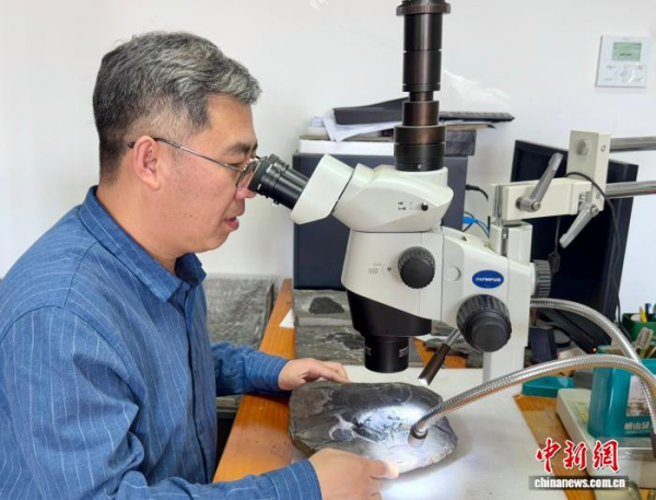 徐光辉研究员通过显微镜观察安妮怀特鱼化石正型标本。中新网记者 孙自法 摄