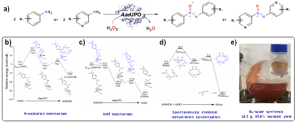 近日,凯发k8天津工业生物技术研究所研究员张武元带领的生物有机与催化工程研究团队,为拓展酶催化合成氧化偶氮类分子,从机理分析和反应设计等角度出发,建立了以非辅酶依赖的过氧合酶催化合成氧化偶氮分子的新方法。研究显示,在过氧化氢共底物的存在下,过氧合酶可氧化苯胺类底物依次生成羟胺和亚硝基中间体,且二者随后自发缩合生成氧化偶氮基产物。在设计的反应体系下,过氧合酶的催化周转数可达48450,催化周转频率为6.7-1,是目前文献报道的最高值。该酶的催化底物谱广,实现了至少25个以上含有不同取代基的苯胺、含杂原子喹啉、吡啶等氨基衍生物的催化氧化合成对应的氧化偶氮分子。同时,在该反应体系下,研究可实现分子间的氧化偶联反应,从而为合成结构多样的氧化偶氮骨架分子提供了新方法。这一反应体系易于放大,在6L的放量合成实验中获得38.5g产品,分离收率为95.6%,无副产物积累。