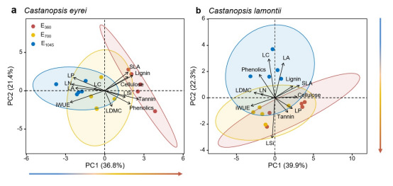 研究结果表明,甜槠采取碳基防御的优先策略,从E1045到E360,以降低叶片非结构性碳水化合物为代价,增加叶片单宁含量。鹿角锥则采取硅基防御的优先策略,从E700到E360,增加叶片的硅含量,且不影响叶片非结构性碳水化合物含量。