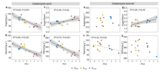 沿海拔梯度的性状共变轴与非结构性碳水化合物(NSCs)的相关性