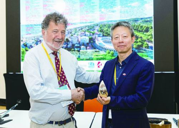 7月9日,意大利佩斯卡拉,雷莫·鲁菲尼为李菂(右)颁奖。受访者供图