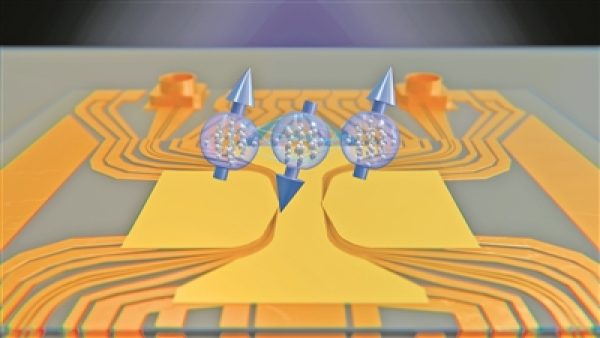 利用3个原子云,它们的自旋(蓝色)在一定距离内相互纠缠,研究人员可以测量电磁场的空间变化。图片来源:瑞士巴塞尔大学